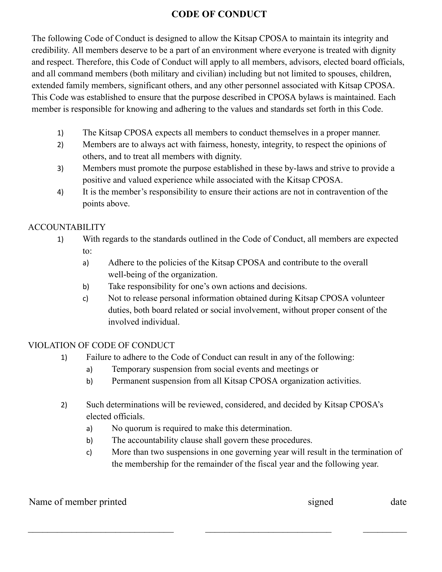 By signing below, you agree to adhere to the Code of Conduct while participating in all Kitsap CPOSA activities.